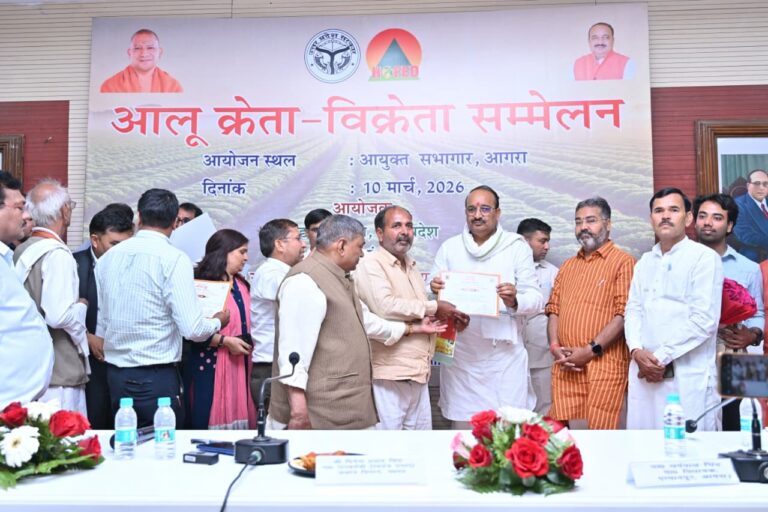 लखनऊ। प्रदेश के उद्यान, कृषि विपणन, कृषि विदेश व्यापार एवं कृषि निर्यात विभाग के राज्यमंत्री (स्वतंत्र प्रभार) दिनेश प्रताप सिंह की अध्यक्षता में आगरा मंडलायुक्त सभागार में आलू क्रेता-विक्रेता सम्मेलन आयोजित किया गया। सम्मेलन में आगरा, हाथरस, मथुरा, मैनपुरी, फिरोजाबाद, कासगंज, एटा, अलीगढ़, फर्रुखाबाद और कन्नौज सहित विभिन्न जनपदों के आलू उत्पादक किसानों, निर्यातकों, शीतगृह...