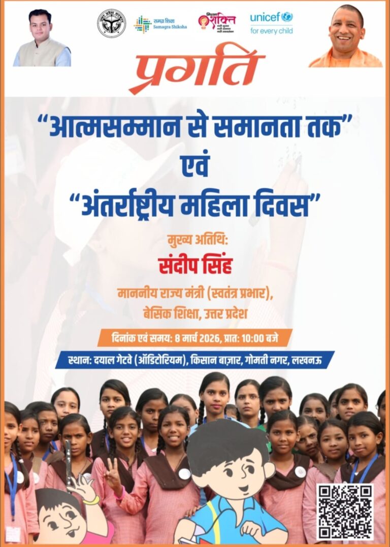 लखनऊ। योगी सरकार की पहल पर अंतरराष्ट्रीय महिला दिवस के अवसर पर राजधानी लखनऊ के दयाल गेटवे, गोमती नगर में बेसिक शिक्षा विभाग, उत्तर प्रदेश द्वारा बालिकाओं के आत्मसम्मान, समानता और सशक्तिकरण को समर्पित कार्यक्रम “प्रगति: आत्मसम्मान से समानता तक – बाल उत्सव” का आयोजन किया गया। कार्यक्रम का शुभारंभ प्रदेश के बेसिक शिक्षा राज्य...