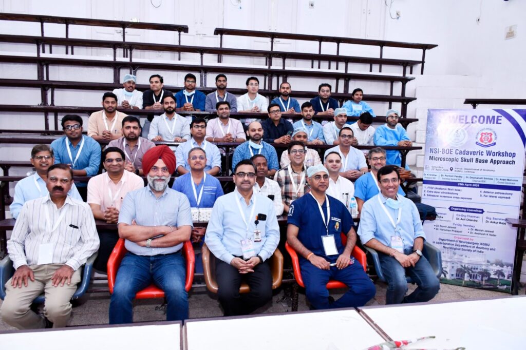 लखनऊ। किंग जॉर्ज मेडिकल यूनिवर्सिटी (केजीएमयू), लखनऊ एक बार फिर चिकित्सा शिक्षा और उच्च स्तरीय सर्जिकल प्रशिक्षण के क्षेत्र में उत्कृष्टता का केंद्र बना, जहां न्यूरोसर्जरी विभाग, एनाटॉमी विभाग तथा न्यूरोलॉजिकल सोसायटी ऑफ इंडिया (NSI) – बोर्ड ऑफ एजुकेशन (BOE) के संयुक्त तत्वावधान में “माइक्रोस्कोपिक स्कल बेस एप्रोच” विषय पर एक दिवसीय कैडैवरिक वर्कशॉप का सफल आयोजन 25 अप्रैल 2026 को एनाटॉमी विभाग के कैडैवरिक स्किल लैब में किया गया।
