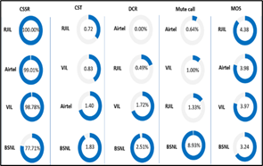 - वॉइस सेवाएं: कॉल सेटअप सफलता दर (सीएसएसआर), कॉल ड्रॉप दर (डीसीआर), कॉल सेटअप समय, कॉल साइलेंस दर, वाक् गुणवत्ता (एमओएस), कवरेज।