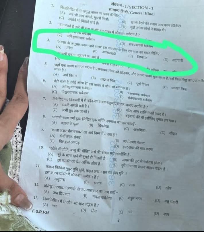 उत्तर प्रदेश पुलिस सब-इंस्पेक्टर (SI) भर्ती परीक्षा के सामान्य हिंदी प्रश्नपत्र में पूछे गए एक सवाल को लेकर विवाद खड़ा हो गया है। प्रश्नपत्र में “अवसर के अनुसार बदल जाने वाला” वाक्यांश के लिए एक शब्द चुनने को कहा गया था। इसके लिए चार विकल्प दिए गए थे—सदाचारी, पंडित, अवसरवादी और निष्कपट। विकल्पों में ‘पंडित’ शब्द शामिल किए जाने पर आपत्ति जताई जा रही है। प्रतियोगी छात्र संघर्ष समिति के मीडिया प्रभारी प्रशांत पांडेय ने इस प्रश्न पर कड़ी आपत्ति व्यक्त की है। उनका कहना है कि अन्य विकल्प किसी गुण या स्वभाव को व्यक्त करते हैं, जबकि ‘पंडित’ शब्द एक विशेष जाति या वर्ग के लिए प्रयुक्त होता है। उन्होंने आरोप लगाया कि इस तरह के प्रश्न समाज में ब्राह्मणों के प्रति विद्वेष फैलाने की मानसिकता को दर्शाते हैं। उन्होंने मांग की कि प्रश्नपत्र तैयार करने वाले विशेषज्ञ के खिलाफ सख्त कार्रवाई की जाए।