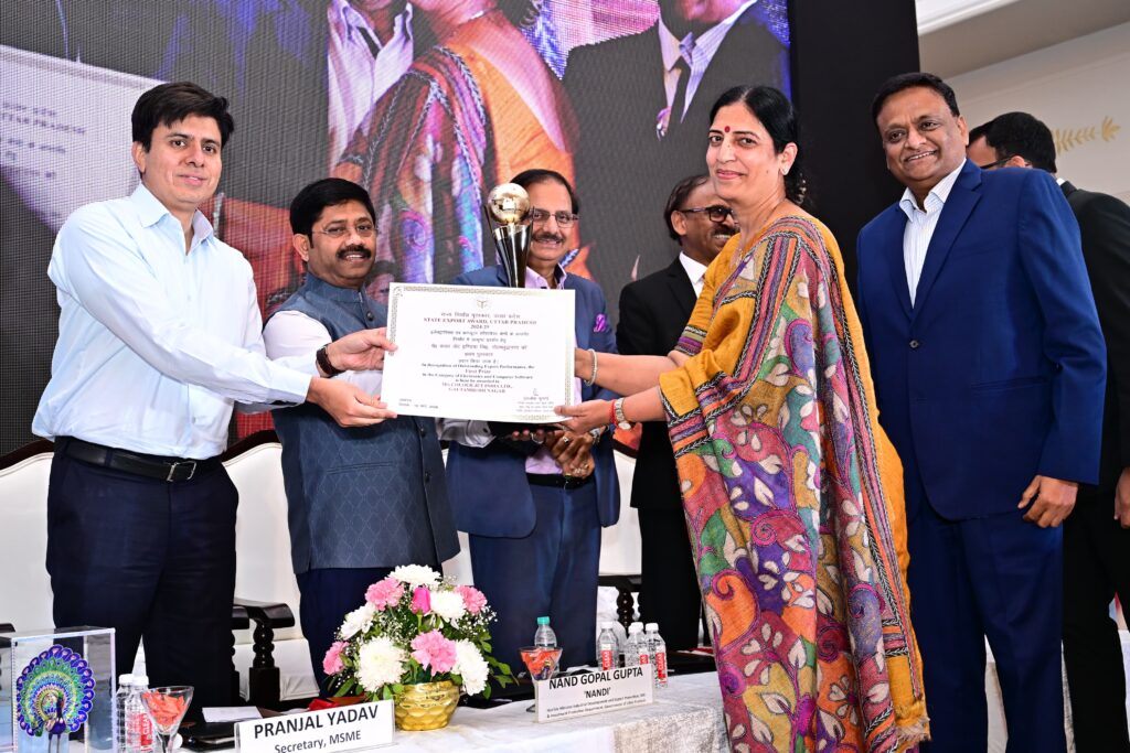 मंत्री नन्दी द्वारा अंतरराष्ट्रीय व्यापार में उत्कृष्टता को बढ़ावा देने, प्रोत्साहित करने और मान्यता देने के लिए विभिन्न श्रेणियों में उत्कृष्ट कार्य करने वाले निर्यातकों को राज्य निर्यात पुरस्कार प्रदान किया गया। जिसमें वित्तीय वर्ष 2023-24 के लिए 19 श्रेणियों में कुल 31 निर्यातकों और वित्तीय वर्ष 2024-25 के लिए 14 श्रेणियों में 23 निर्यातकों को सम्मानित किया गया। जिसमें गाजियाबाद की निर्यातक इकाई मे० अल नासिर एक्सपोर्ट्स प्राइवेट लिमिटेड को वित्तीय वर्ष 2023-24 के लिए सभी श्रेणियों में सर्वश्रेष्ठ पुरस्कार दिया गया तथा अलीगढ़ की निर्यातक इकाई मे० अल अम्मार फ्रोजन फूड एक्सपोर्ट्स प्राइवेट लिमिटेड को वित्तीय वर्ष 2024-25 के लिए पुरस्कार दिया गया। इस अवसर पर प्रांजल यादव सचिव एमएसएमई, डॉ. अजय सहाय महानिदेशक फियो, डॉ. अभय सिन्हा महानिदेशक एस.ई.पी.सी., राकेश कुमार महानिदेशक ई.पी.सी.एच., पवन अग्रवाल अपर आयुक्त निर्यात के साथ ही विभिन्न जनपदों से आए निर्यातक मौजूद रहे।